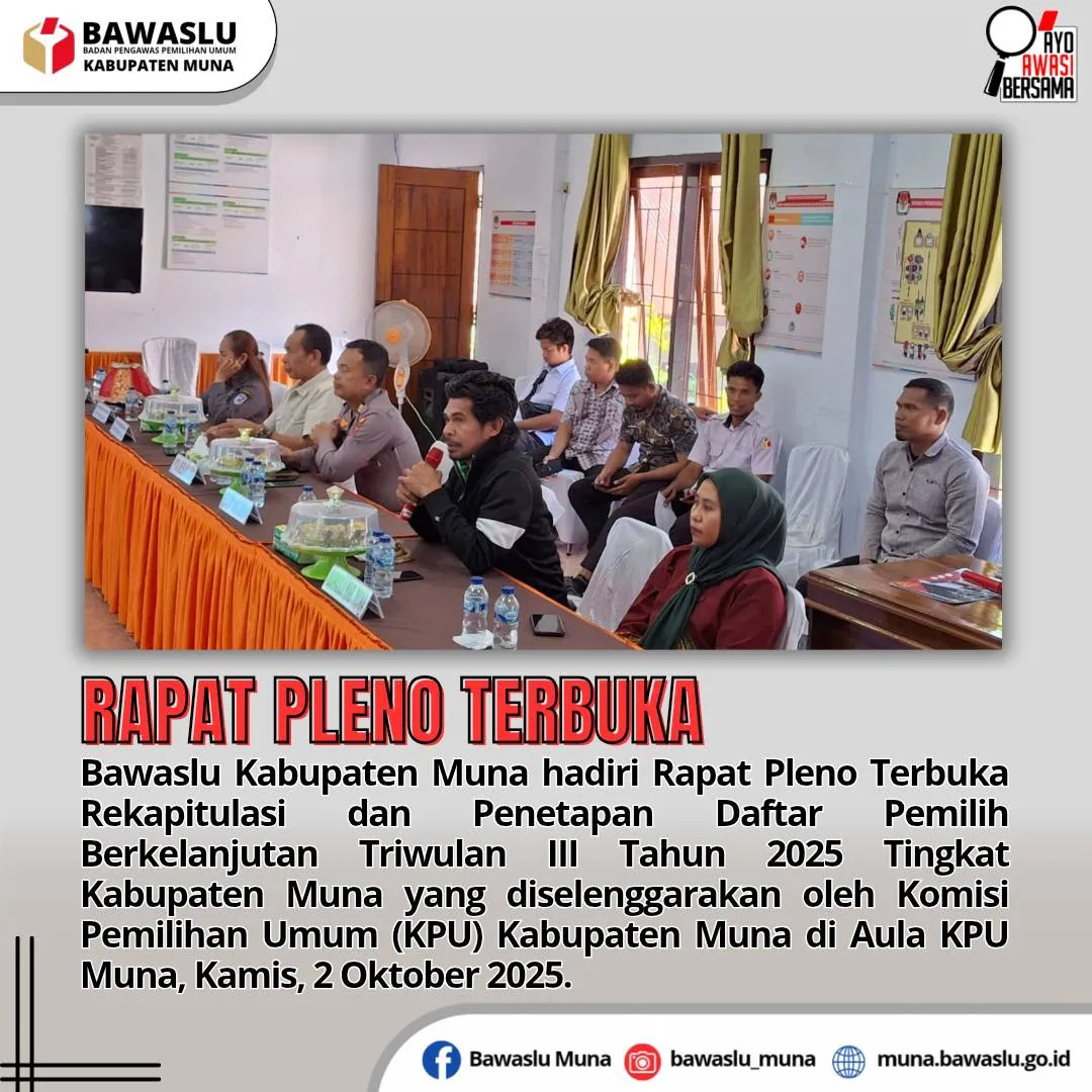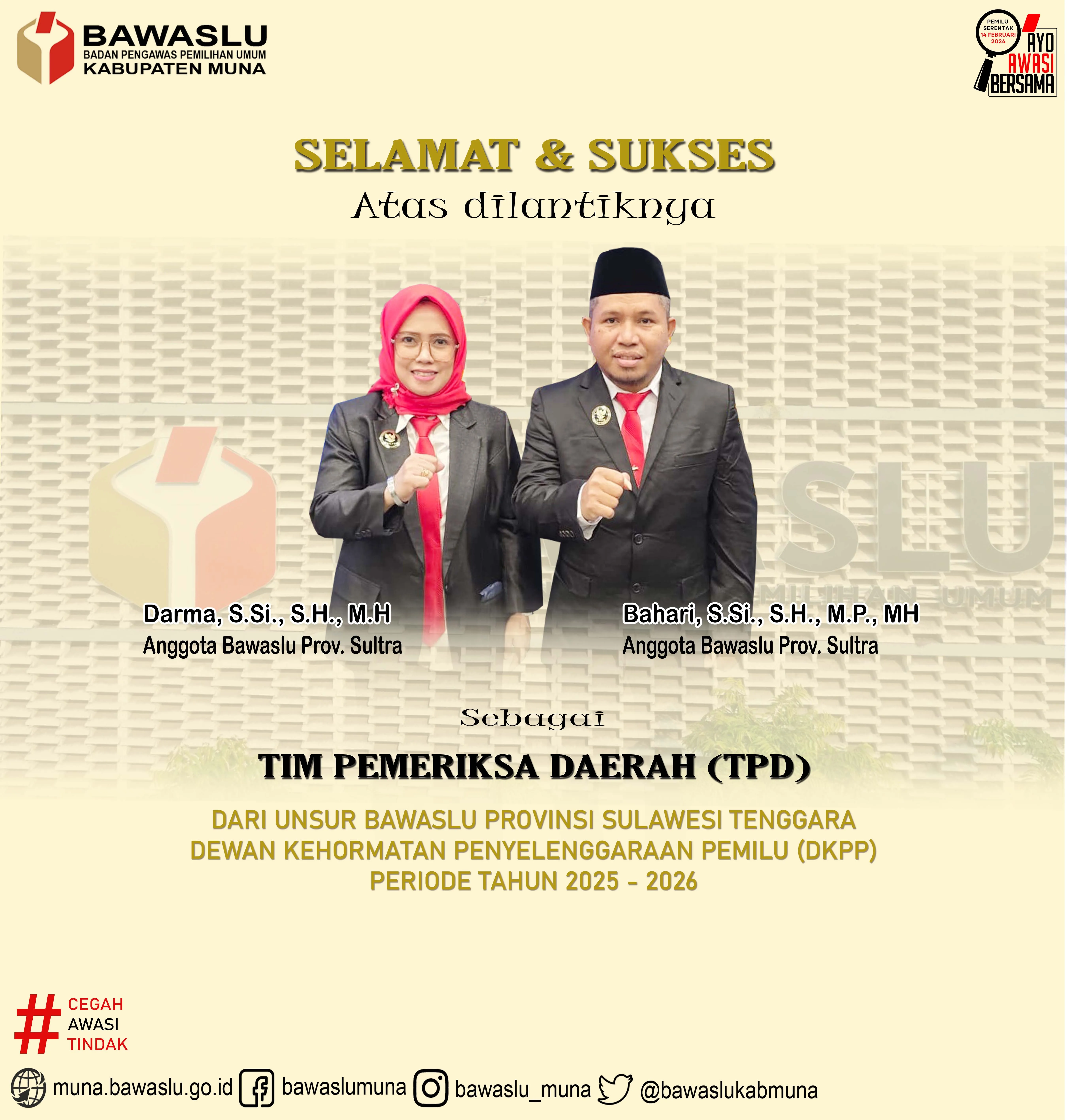 Pengumuman Pengumuman Lihat Selengkapnya Lapor Pelanggaran Pemilu Hasil Pengawasan Tahapan Pemilu 2024 Ajukan Permohonan Sengketa Proses Pemilu Bagaimana Cara Ikut Awasi Pemilu Lapor Hoaks Pemilu Apa Saja Yang Diawasi Pada Tahapan Pemilu Berita Bawaslu Kabupaten Muna gelar diskusi dan penandatanganan Perjanjian Kerja Sama (PKS) dengan HMI Cabang Raha humas Rabu, Januari 21, 2026 - 08:51 Bawaslu Kabupaten Muna menggelar upacara Peringatan Hari Ibu (PHI) Ke-97 Tahun 2025 di halaman Kantor Sekretariat Bawaslu Kabupaten Muna humas Senin, Desember 22, 2025 - 18:05 Bawaslu Kabupaten Muna Hadiri Pelaksanaan Rapat Koordinasi (Rakoor) Pemuktahiran Data Partai Politik humas Jumat, Desember 12, 2025 - 14:22 Bawaslu Kabupaten Muna melakukan Koordinasi dengan Wakil Bupati Muna, Mengenai Gerakan Pramuka Kabupaten Muna terpilih humas Senin, November 17, 2025 - 19:52 Bawaslu Kabupaten Muna melaksanakan kegiatan Fasilitasi dan Penguatan Pemahaman Kepemiluan Pada Kelompok Dishabilitas humas Rabu, November 5, 2025 - 21:55 https://sigaplapor.bawaslu.go.id/ https://ppid-muna.bawaslu.go.id https://sips.bawaslu.go.id/ https://google.com https://jdih.bawaslu.go.id/ Galeri Isra Mi'raj Nabi Muhammad SAW Hari Desa Nasional 2026 Pemilu Nasional dan Pemilu Lokal Selamat Hari Natal Selamat hari Ibu Ke-97 tahun Hari Disabilitas Internasional 2025 Memperingati Hari Guru Nasional Tahun 2025 Hari Pahlawan 10 November 2025 TIM PEMERIKSA DAERAH (TPD) DARI UNSUR BAWASLU PROVINSI SULAWESI TENGGARA DEWAN KEHORMATAN PENYELENGGARAAN PEMILU (DKPP) PERIODE TAHUN 2025 - 2026 Memperingati Hari Sumpah Pemuda, 28 Oktober 2025 Selamat memperingati hari Santri Nasional, 22 Oktober 2025 Rapat Pleno Terbuka Rekapitulasi dan Penetapan Daftar Pemilih Berkelanjutan Triwulan III Tahun 2025. Kamis, 02 Oktober 2025 Pencarian Saran dan Pengaduan Saran dan pengaduan dengan untuk kemajuan Bawaslu Ajukan